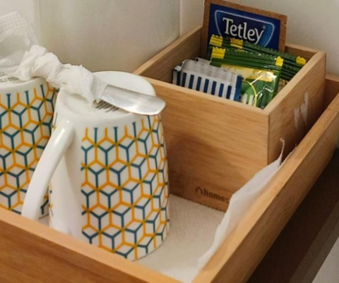 it comes equipped with modern amenities including a 32” TV, complimentary breakfast, and a tea & coffee maker, making it an